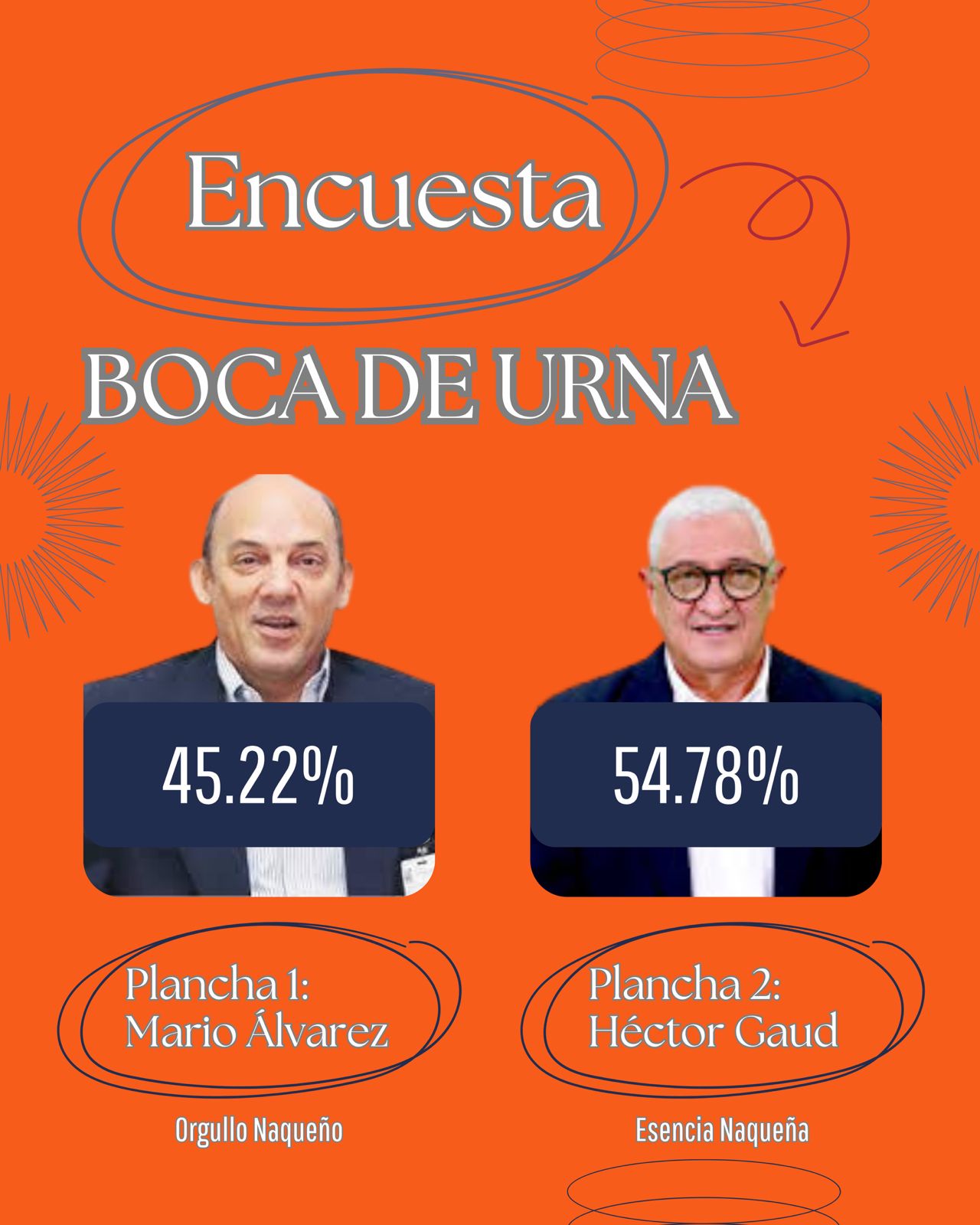Según fuentes cercanas al club nos informan que la plancha número 2 y su presidente Héctor Gaud Esencia Naqueña encabezan las votaciones con un poco más del 54% frente un poco más de 45% de la plancha número 1 su presidente Mario Álvarez.