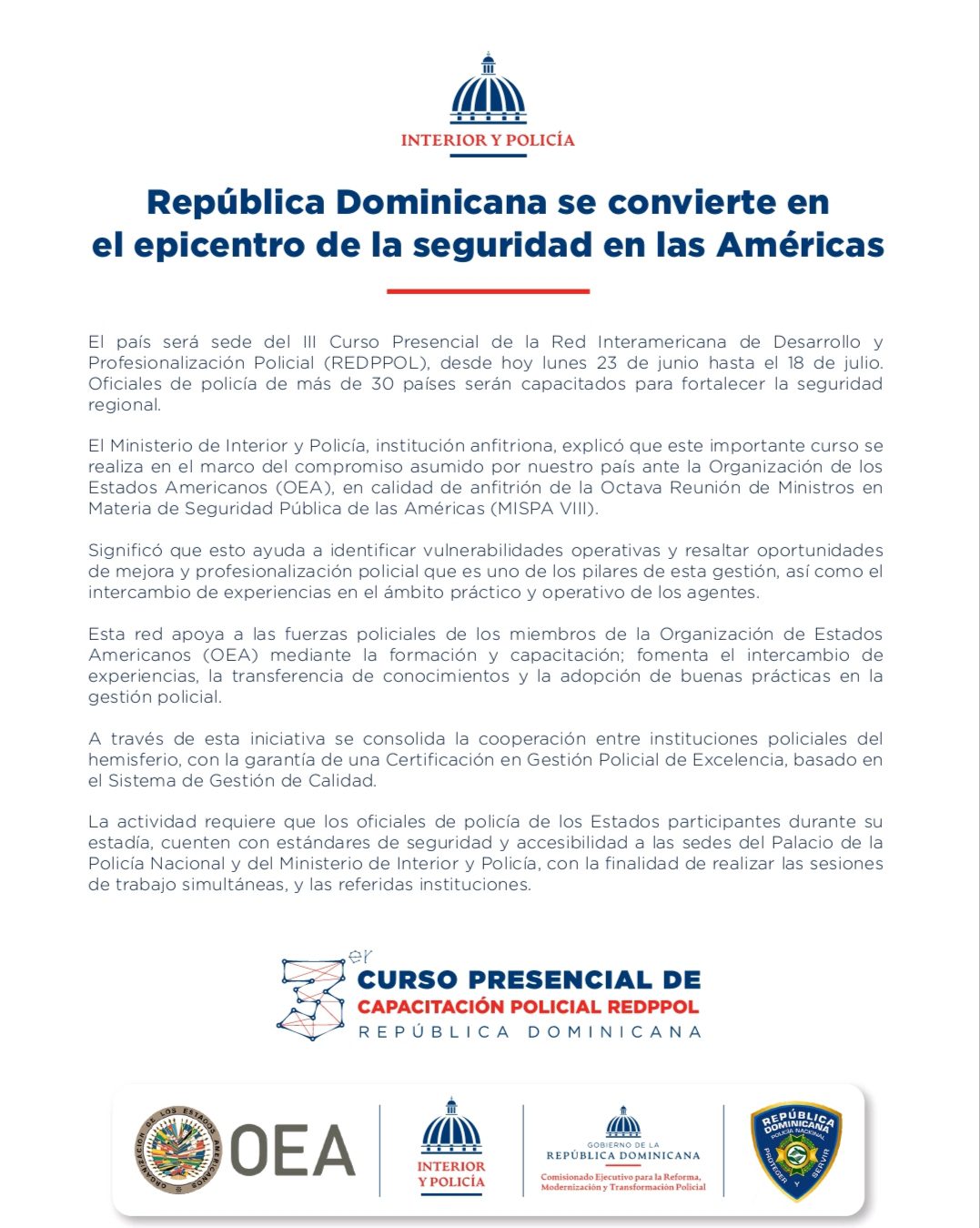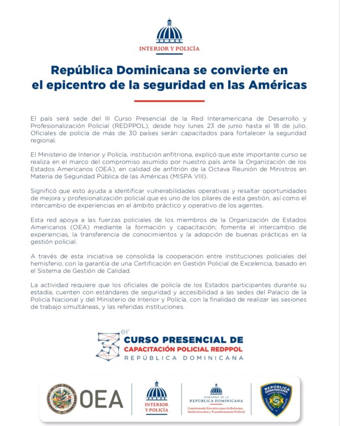InicioActualidadMinisterio De Interior y Policía auspicia capacitación en alianza con la OEA Actualidad Ministerio De Interior y Policía auspicia capacitación en alianza con la OEA Por El Pueblo junio 27, 2025 0 26 FacebookTwitterWhatsAppLinkedinEmailImpresión FacebookTwitterWhatsAppLinkedinEmailImpresión Artículo anteriorCarolina Mejía Su mirada en una frontera digna de la continuidad y progreso de sus proyectos.Artículo siguienteFredy Fernández motiva a jóvenes de Santiago a liderar con propósito y compromiso El Pueblohttps://elpueblo.com.do Noticias Relacionados Actualidad Senador Julito Fulcar hace llamado a la prudencia durante lanzamiento del operativo “Conciencia por la Vida 2026” en Baní El Pueblo - abril 1, 2026 Actualidad Carolina tiene la mejor imagen positiva entre alcaldes Latinoamérica El Pueblo - marzo 31, 2026 Actualidad COOPNAMA reconoce trayectoria y aportes del médico y filántropo Cruz Jiminián y del profesor Melanio Hernández, autor del libro Nacho El Pueblo - marzo 30, 2026 Lo más leído Senador Julito Fulcar hace llamado a la prudencia durante lanzamiento del operativo “Conciencia por la Vida 2026” en Baní abril 1, 2026 Avanzada Democrática Moderna realiza jornada de Formación Política y Liderazgo en EUA agosto 20, 2025 PRM, alcaldías y protocolo de actuación municipal mayo 6, 2020 00:00:51 Se Van Video Musical El Antinoti mayo 6, 2020