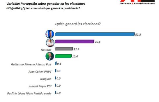 A los encuestados se les preguntó ¿Quién cree usted que ganará la Presidencia?, y el 52.3% dijo que Abinader; un 25.4% Castillo; 10.4% Fernández; el 1.7% Moreno y un 3.0% no sabe.
